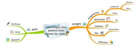 Vous créez une branche "image" et une branche "mot". A quoi les images vous font-elles penser ? Les termes couleur, dimension, imagination vous viennent peut-être à l'esprit. Vous les indiquez sur des sous-branches. Qu'est-ce que l'imagination pour vous ? Vous allez peut-être penser à la créativité, ... Vous travaillez par association d'idées. En continuant à vous poser des questions, vous allez obtenir tous les mots clés dont vous avez besoin pour rédiger votre réponse.