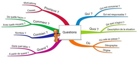 Si les mots ne viennent pas facilement, utilisez la méthode des journalistes : CQQCOQP. Vous questionnez votre sujet avec : Qui ? Quoi ? Où ? Quand ? Comment ? Combien ? Pourquoi ? Cela vous permettra de faire le tour du sujet sans rien oublier. Utiliser ces questions sous forme de Mind Map permet d'augmenter les associations d'idées.