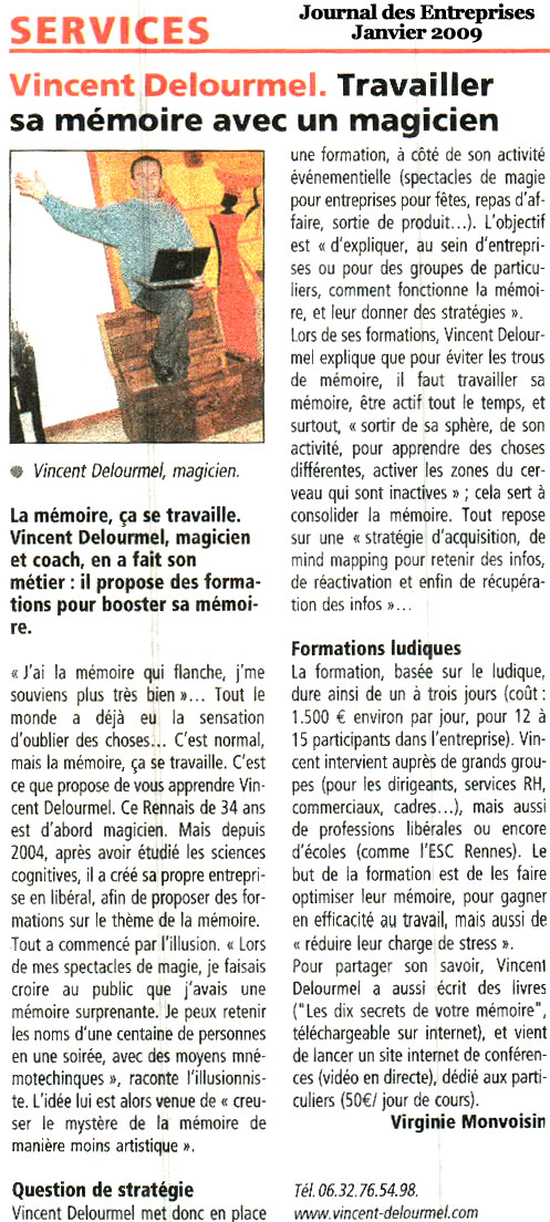 Mon nom est Vincent Delourmel et je suis mnémoniste. Qu'est-ce qu'un mnémoniste ? Il s'agit d'un expert des stratégies de mémorisation. J'aime dire que je suis un "artiste de la mémoire". C'est en 1989 que j'ai débuté comme prestidigitateur/illusionniste. En 1995, je découvre l'art de la mémoire, que j'exploite sur scène pour étonner un large public. De fil en aiguille, je me suis intéressé de façon plus précise, scientifique, à cette faculté mystérieuse, par certains aspects "magique", à la base de toute cognition. Au début des années 2000, j'ai écrit mon premier livre, "Les 10 Secrets de Votre Mémoire".