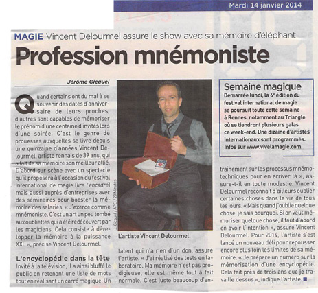 Durant mes années de travail ( maintenant à la retraite ) j'ai toujours ébloui mes collègues de travail, mes patrons en leur donnant souvent des réponses précises au sujet d'événements passés. Je me faisais tellement déranger souvent, qu'à une certaine période j'ai décidé de me servir d'une anesthésie générale du à une opération pour le foie en 2004, le 7 octobre pour être précis, et pour véhiculer que ma mémoire s'était beaucoup envolée. Après ce leurre verbal, j'ai enfin eu la paix dans mon travail jusqu'à ma retraite. Vincent et moi on se connaît par le biais du Web depuis l'an 1999. Je me souviens qu'il était magicien pour les anniversaires pour les enfants, une passion qu'il adorait vu qu'il aime beaucoup ses semblables. Dans le temps j'étudiais une méthode depuis plusieurs mois pour améliorer ma mémoire. Pour faire court, Vincent m'a dépassé en dieuble niveau mémoire. Je te lève mon chapeau!