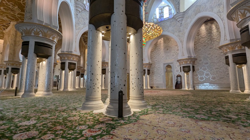 Pour tout vous dire, j'ai rarement vu un bâtiment aussi beau. Peu importe qu'il soit religieux, quand vous vous retrouvez devant cette Mosquée, vous ne pouvez que rester subjugué. D'ailleurs, la plupart du temps, quand je me retrouve dans une église, une cathédrale ou autres lieux de culte, je ne peux m'empêcher d'imaginer le temps et les efforts nécessaires à sa construction. Il a fallu d'ailleurs 12 années de travaux pour construire la mosquée Cheikh Zayed que le grand public peut visiter. Petite anecdote : quand j'ai voulu y entrer, on m'a demandé de rebrousser chemin et d'entrer plus loin, par un centre commercial souterrain ! Et en effet, vous devez d'abord vous enregistrer, puis traverser le centre commercial (des fois que vous auriez besoin de quelque chose) et ensuite de longs couloirs où des photos retracent l'histoire de sa construction.