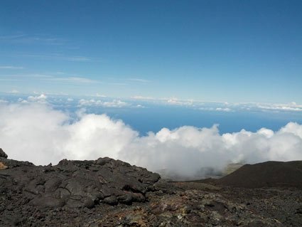 Par un pur hasard, je rencontre un métropolitain issu de la même ville o๠j'ai grandi ; nous entreprenons de monter le Piton de la Fournaise, en espérant qu'il fasse meilleur. Et c'est le cas ; c'est par une matinée très ensoleillée que j'y retourne, avec la ferme intention de m'approcher au plus près. Sur les guides et à la maison du volcan, ils annoncent 5h30 de randonnée pour atteindre le haut et redescendre. Nous l'avons fait en 4h00 ; nous sommes bons marcheurs, mais pas non plus des furieux ; les temps sont vraiment calculés larges.