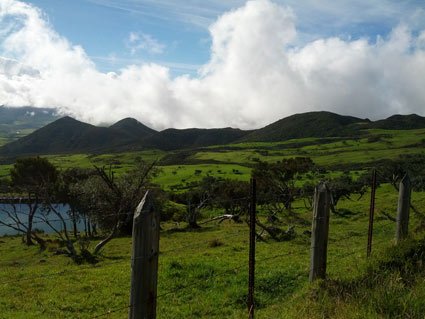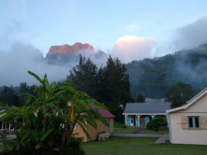 Dès le lendemain de mon arrivée, nous sommes montés dans les hauteurs de la Plaine des Palmistes, vers la Plaine des Cafres, à Bourg Murat très exactement o๠une table d'hôte avait été réservée, ainsi qu'une nuit : le Pêcher Gourmand, établissement très sympa que je vous recommande chaudement. L'endroit est relativement frais, ce qui peut paraître déconcertant car à quelques kilomètres de là , sur le littoral, il fait très chaud. Prévoyez donc une petite laine. La Plaine des Palmistes me rappelle l'Auvergne par endroits ; c'est très vert, il y a des élevages, des prairies. Pourtant, pas très loin, le volcan réserve déjà un autre paysage. Justement, c'est notre destination dès le lendemain matin et j'ai vraiment hâte d'y être.