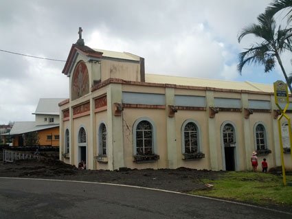 Nous reprenons la route, direction Saint Pierre, dans le sud. Le brouillard, la pluie et le froid laissent peu à peu la place au soleil, les palmiers, l'océan et la chaleur ; en l'espace de 30 mn, le paysage et les conditions météo changent rapidement. Nous contournons l'île par le sud est, en direction du Grand Brûlé, versant ou s'évacue le volcan, où les coulées de lave sont les plus spectaculaires. Dans cette région, une église, appelée l'église Notre Dame des laves a même échappé "miraculeusement" à une éruption : la lave a contourné l'édifice pour l'épargner. C'était en 1977.