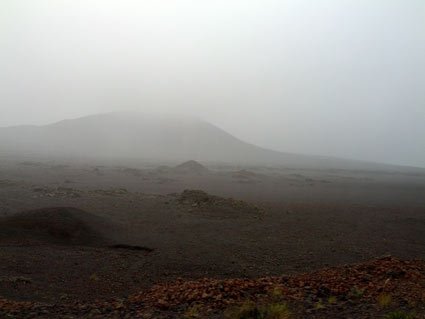Un paysage lunaire accentué par le brouillard : le volcan !